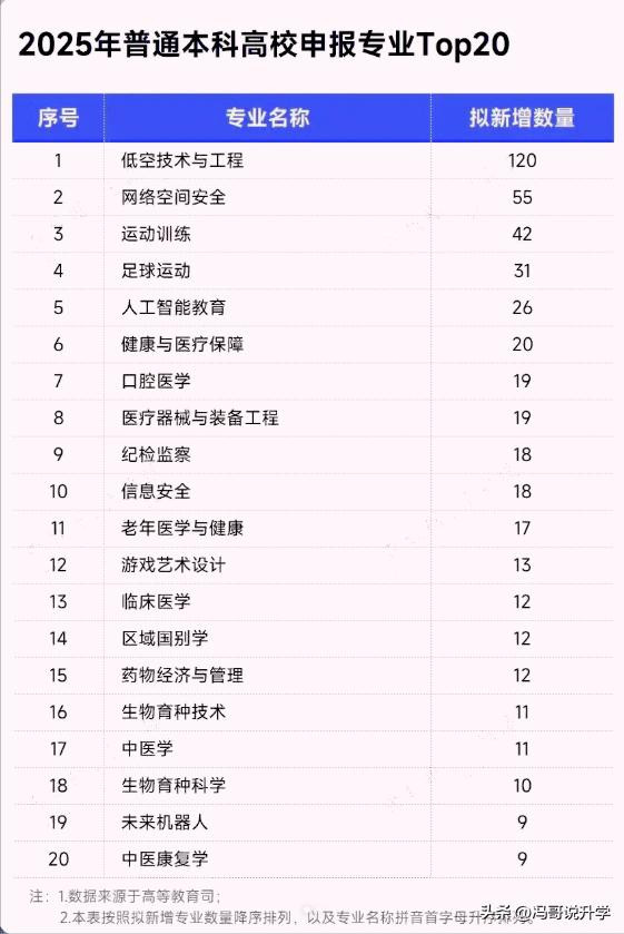运动训练和足球运动专业热度也不低,分别有 34 所和 28 所高校申报 。体育市场不断扩大,足球作为全球热门运动,相关专业人才无论是参与球员培养,还是赛事组织,都有不错的发展空间。健康与医疗保障、人工智能教育、口腔医学、信息安全、医疗器械与装备工程、老年医学与健康等专业也深受非 “双一流” 高校青睐 。随着生活水平提升,人们对健康越发重视,这些专业围绕医疗健康领域,培养实用型人才,从健康管理到医疗设备研发,各个环节都不可或缺。